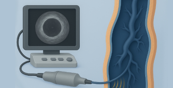 Intravascular Ultrasound (IVUS) provides real-time imaging from inside the vein using a tiny ultrasound probe. This advanced diagnostic tool gives detailed views of the vein wall and lumen, helping physicians identify areas of narrowing or damage. IVUS is often used to guide treatment during complex cases of venous obstruction or post-thrombotic syndrome.