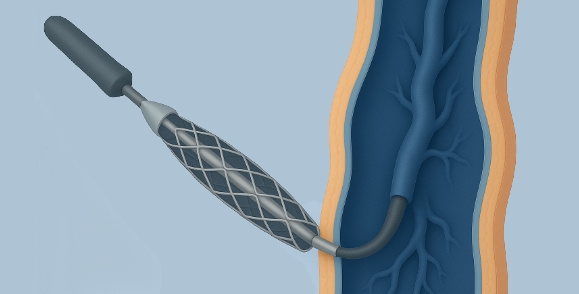 In patients with narrowed or obstructed veins, a small mesh tube called a stent can be placed to keep the vein open and restore normal blood flow. The stent is delivered via catheter and expanded at the site of the blockage. Once in place, it provides long-term support to the vein wall and can significantly improve symptoms like leg pain, swelling, or fatigue caused by poor circulation.